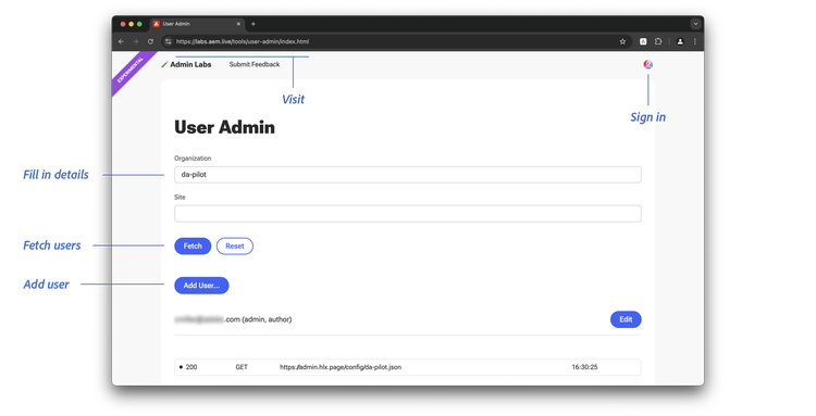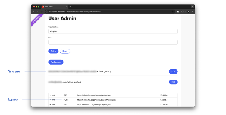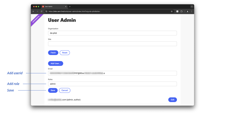Congratulations! You have successfully added your IMS userid to AEM Edge Delivery Services. Going forward, you can use DA's AEM Permissions app to manage users and roles for this organization and sites.