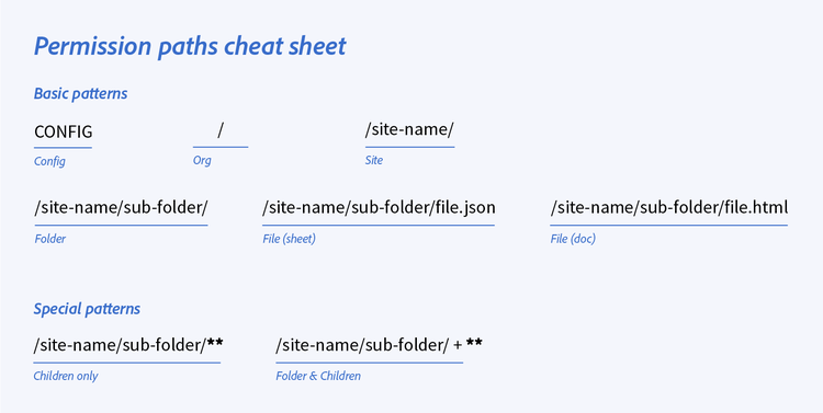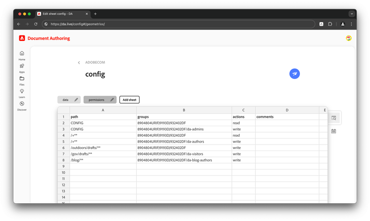 - Sheet-based - Access and permissions are controlled through the config sheet for your organization. The syntax will feel familiar to anyone who has managed a metadata sheet for Edge Delivery Services.